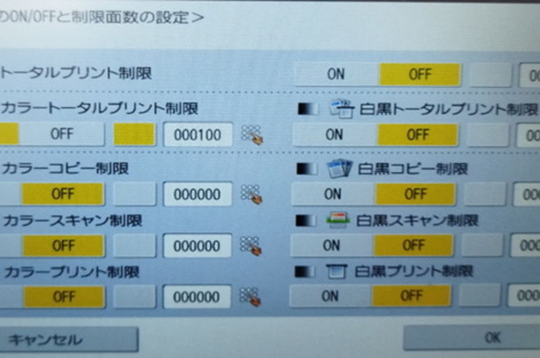 部門管理でカラー印刷以外の制限もできます。PCごとに制限枚数を指定も可能です。