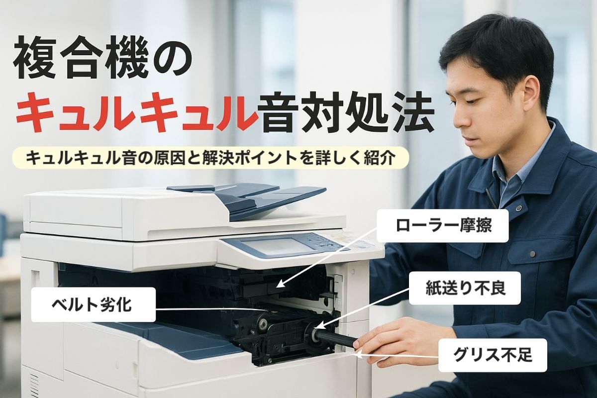 2025/12/12複合機から突然“キュルキュル”という異音がして、不安になったことはありませんか?実は、オフィスで発生する複合機の異音トラブルのうち、キュルキュル音に悩... -